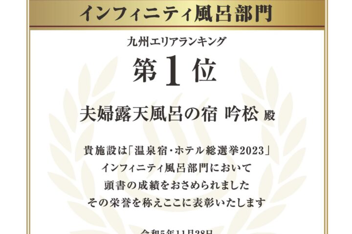 「温泉宿・ホテル総選挙2023」 九州エリア1位受賞のお知らせ