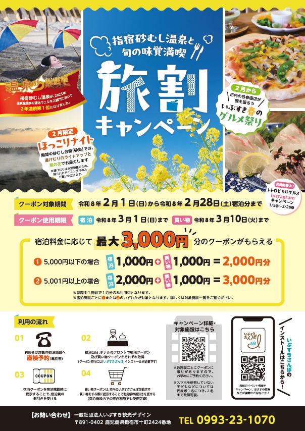指宿市は「指宿砂むし温泉と旬の味覚満喫旅割キャンペーン」をおこない、宿泊費の割引と市内での食事や買い物に使える最大3,000円分のデジタルクーポンを発行いたします。