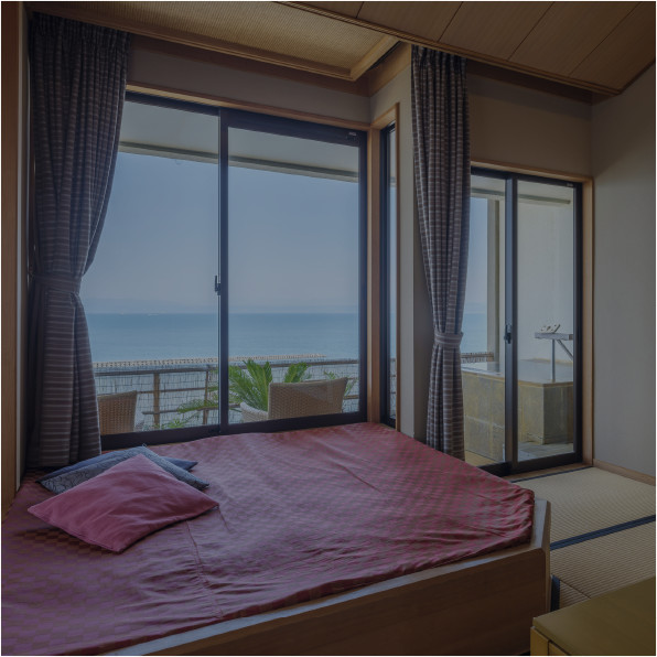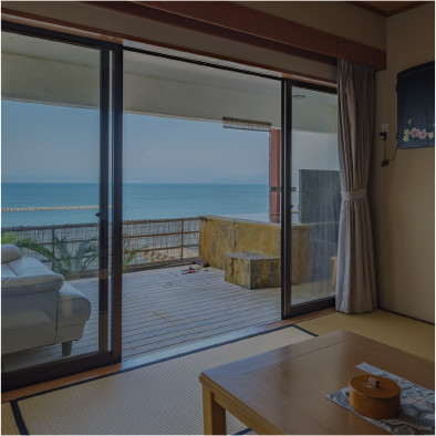 和室に陶器型の露天風呂 間近に海が見えるお部屋