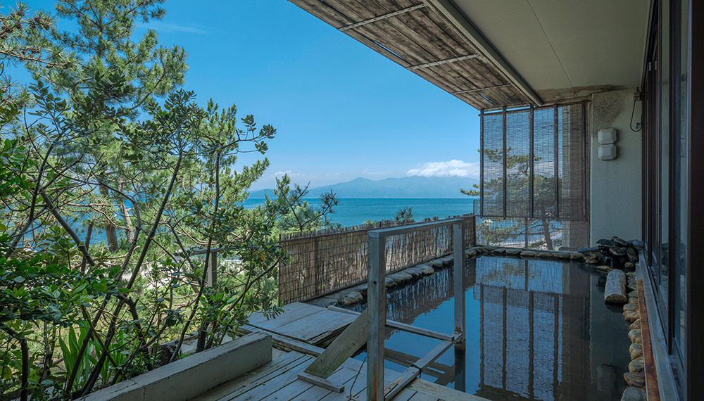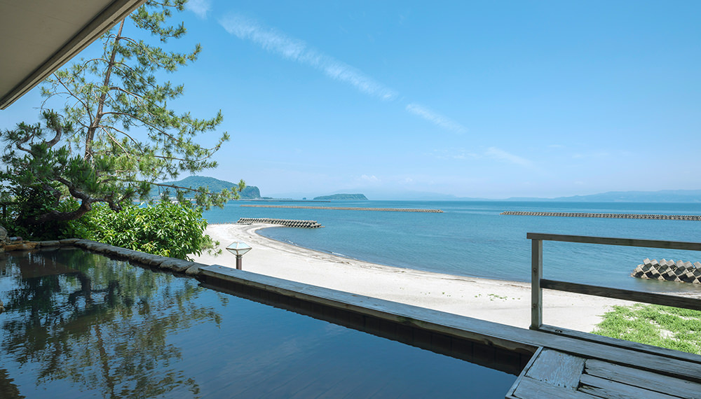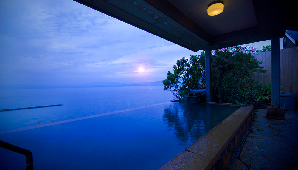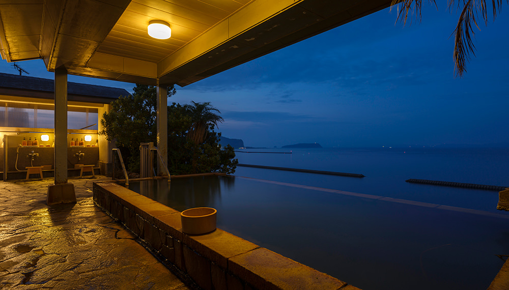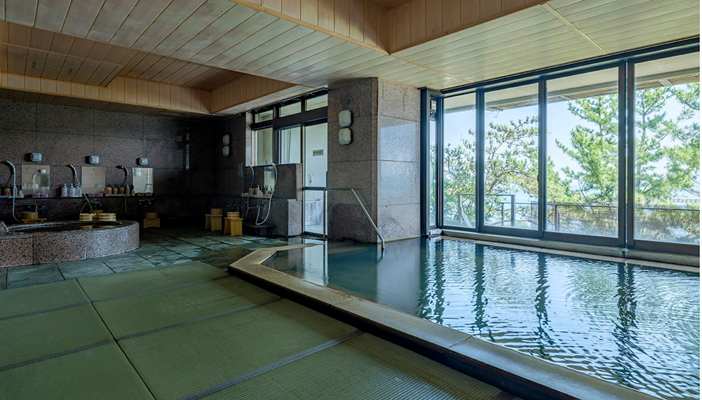 大浴場(内湯・露天風呂)は正面に海を眺める当館2階。露天風呂に出ると、心地よい波音と潮の香りに包まれます。海を間近に感じながらの入浴は、天空野天風呂とは一味違った趣があり、贅沢なひとときをお過ごしいただけます。もちろんお湯は源泉かけ流し。お肌を保護しメラニンを整えるメタケイ酸を多く含んでいるため、美人の湯とも呼ばれています。