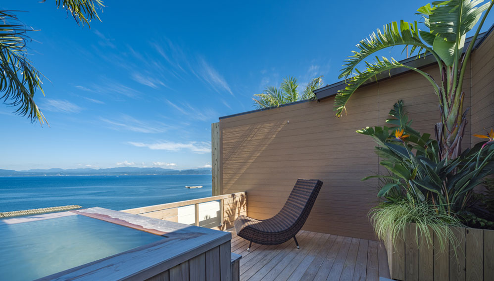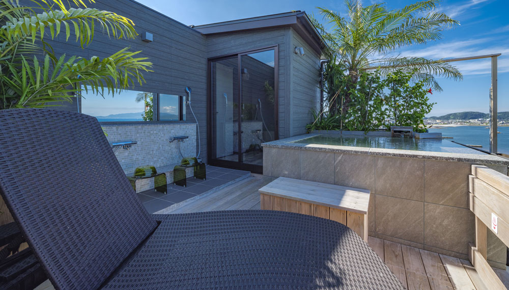 雲上貸切露天風呂は「空、星、海」という3部屋の貸切露天風呂で、吟松の9階にございます。眼前に広がる錦江湾と大隅半島の景色を温泉に浸かりながらご堪能いただけます。大切な方との特別なお時間をごゆっくりとお過ごしください。