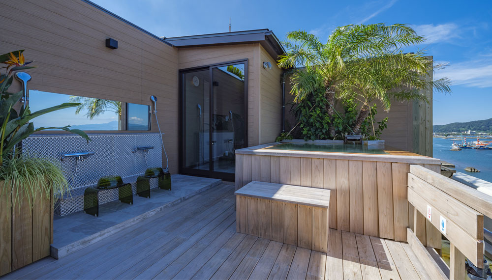 天空野天風呂は吟松の9階にございます。眼前に広がる青い海と空。湯船につかると、空に漂い、天から海を見下ろすような心地よさ。景色は季節や時間帯によって変化。朝・昼・夜とご入浴いただけますので、ぜひ時間帯によって異なる表情を見せる、天空野天風呂の景色をお楽しみください。